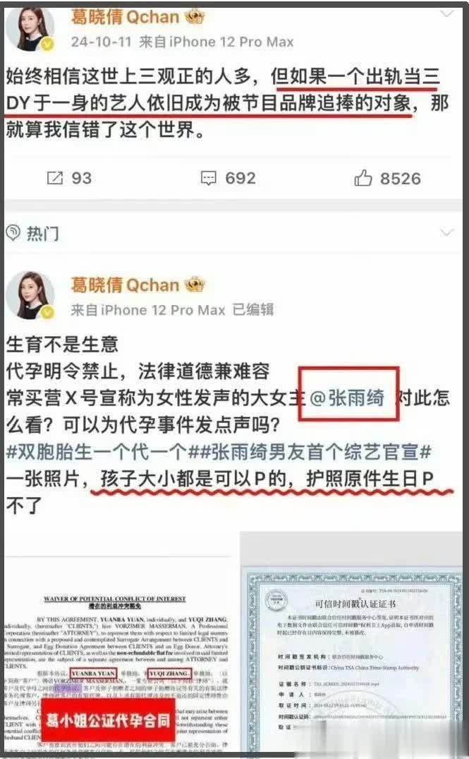 葛晓倩态度好强硬!针对张雨绮涉嫌代孕一事,她反复质疑了好多次,除了点名道姓公开喊话,葛晓倩还晒过对方代孕合同。