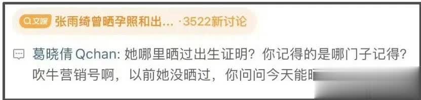 别急,葛晓倩还在热搜下某账号的澄清动态下方评论了,她的留言清清楚楚,明确质疑张雨绮两个孩子出生日期,强调张雨绮从来没有晒出过出生证明,以前没晒过,至于以后会不会晒,就要问问张雨绮如今能不能晒了