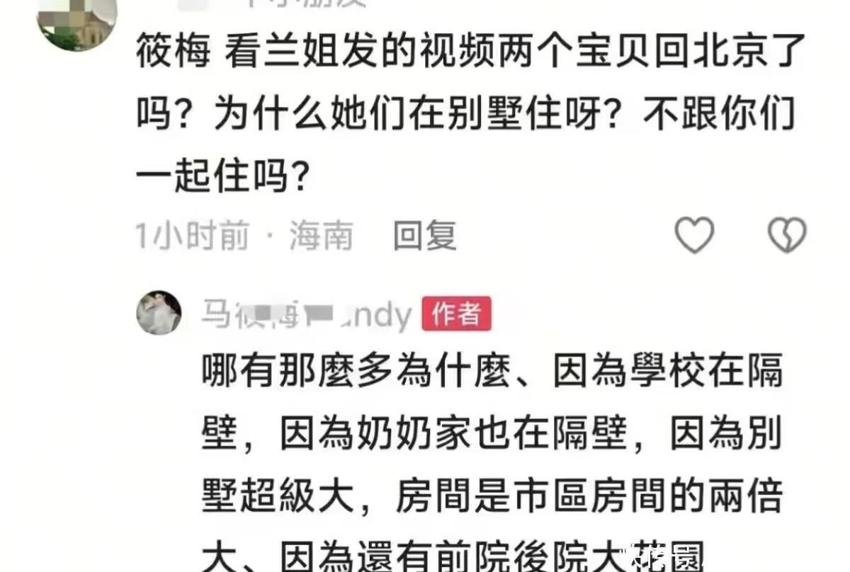 筱梅的回答,引发了网友的猜想,她说因为学校在隔壁,奶奶家也在隔壁,而且奶奶家的房间是他们市区房间都两倍大,还有大花园,所以俩孩子就跟奶奶住啦!而奶奶住的地方,就是住的富人区别墅,而周围配套的有国际学校,人工湖啥的!